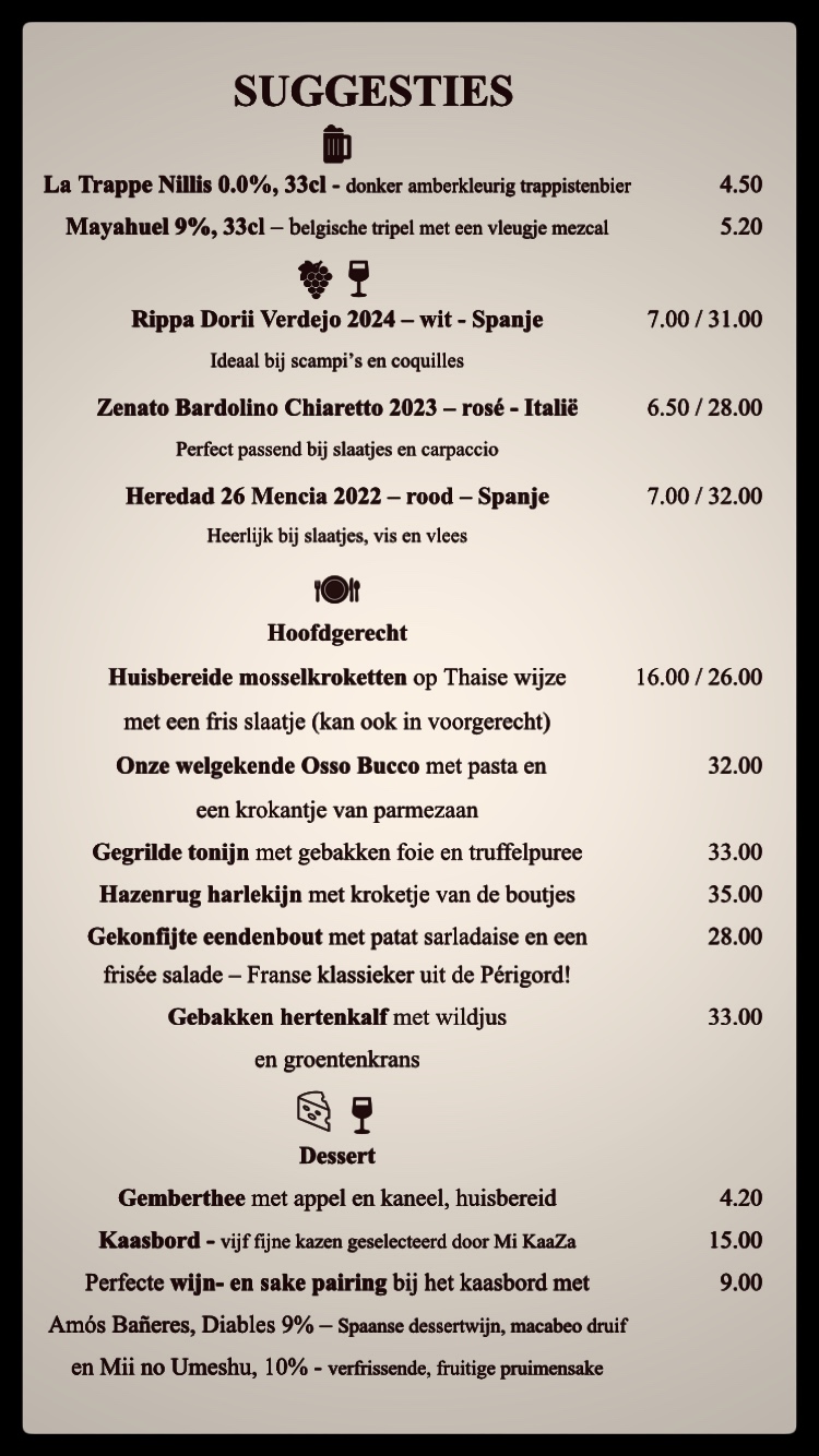 Zowel klassieke keuken als hedendaagse gerechten kunt u terug vinden op de menukaart, regelmatig worden nieuwe suggesties geserveerd.
